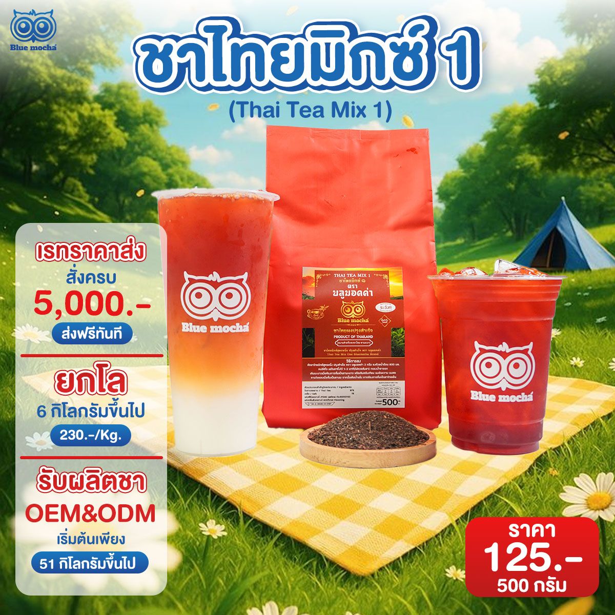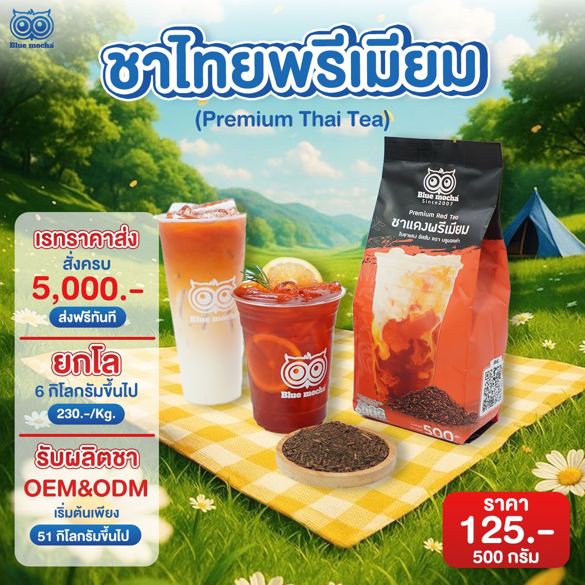 โรงงานผลิตชาเชียงใหม่ Bluemocha (บลูมอคค่า) เราคือผู้เชี่ยวชาญด้านการให้บริการ รับผลิตชา OEM (สร้างแบรนด์ชาเป็นของคุณเอง) ODM (พัฒนาสูตรชาเป็นของคุณเอง) ตลอดจนการจำหน่ายใบชาต่าง ๆ ทั้งชาไทย ชาเขียว ชาไต้หวัน โกโก้ เมล็ดกาแฟ และอื่น ๆ อีกมากมาย ด้วยประสบการณ์โดยตรงเกี่ยวกับชากว่า 19 ปี จนวันนี้ Bluemocha เราคือผู้เชี่ยวชาญที่พร้อมให้ทุกคำแนะนำ เกี่ยวกับธุรกิจชา–กาแฟ ให้ประสบความสำเร็จอย่างยั่งยืน
