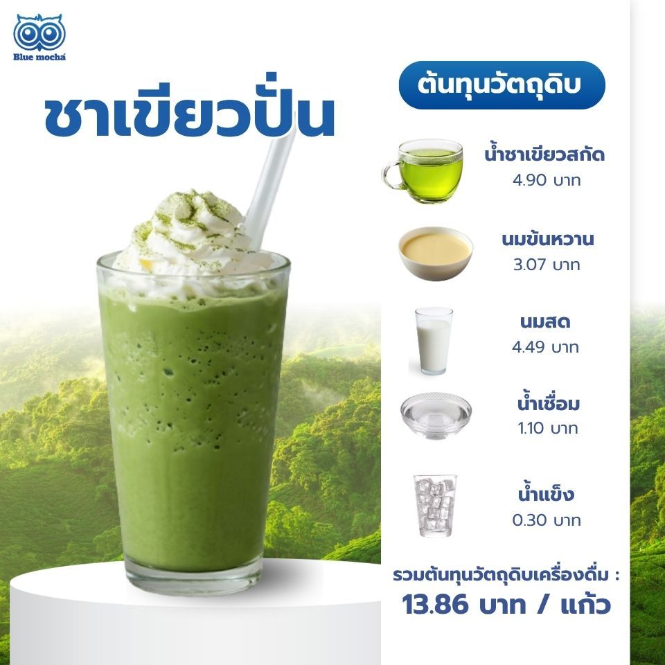 รวมต้นทุนวัตถุดิบเครื่องดื่ม : 13.86 บาท / แก้ว