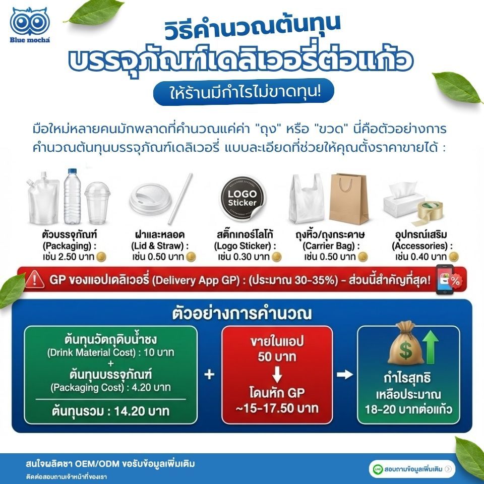 มือใหม่หลายคนมักพลาดที่คำนวณแค่ค่า "ถุง" หรือ "ขวด" แต่ลืมนึกถึงองค์ประกอบอื่น ๆ ไป นี่คือตัวอย่างการคำนวณต้นทุนบรรจุภัณฑ์เดลิเวอรี่ แบบละเอียดที่ช่วยให้คุณตั้งราคาขายได้แม่นยำขึ้น :