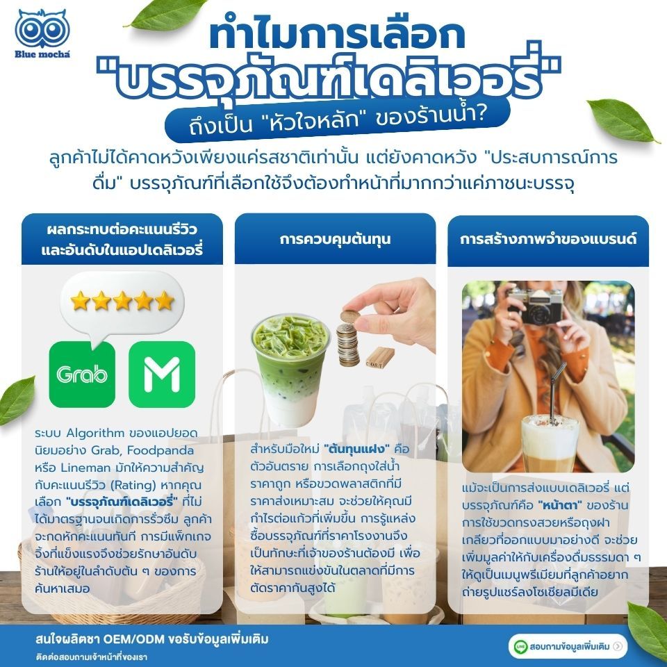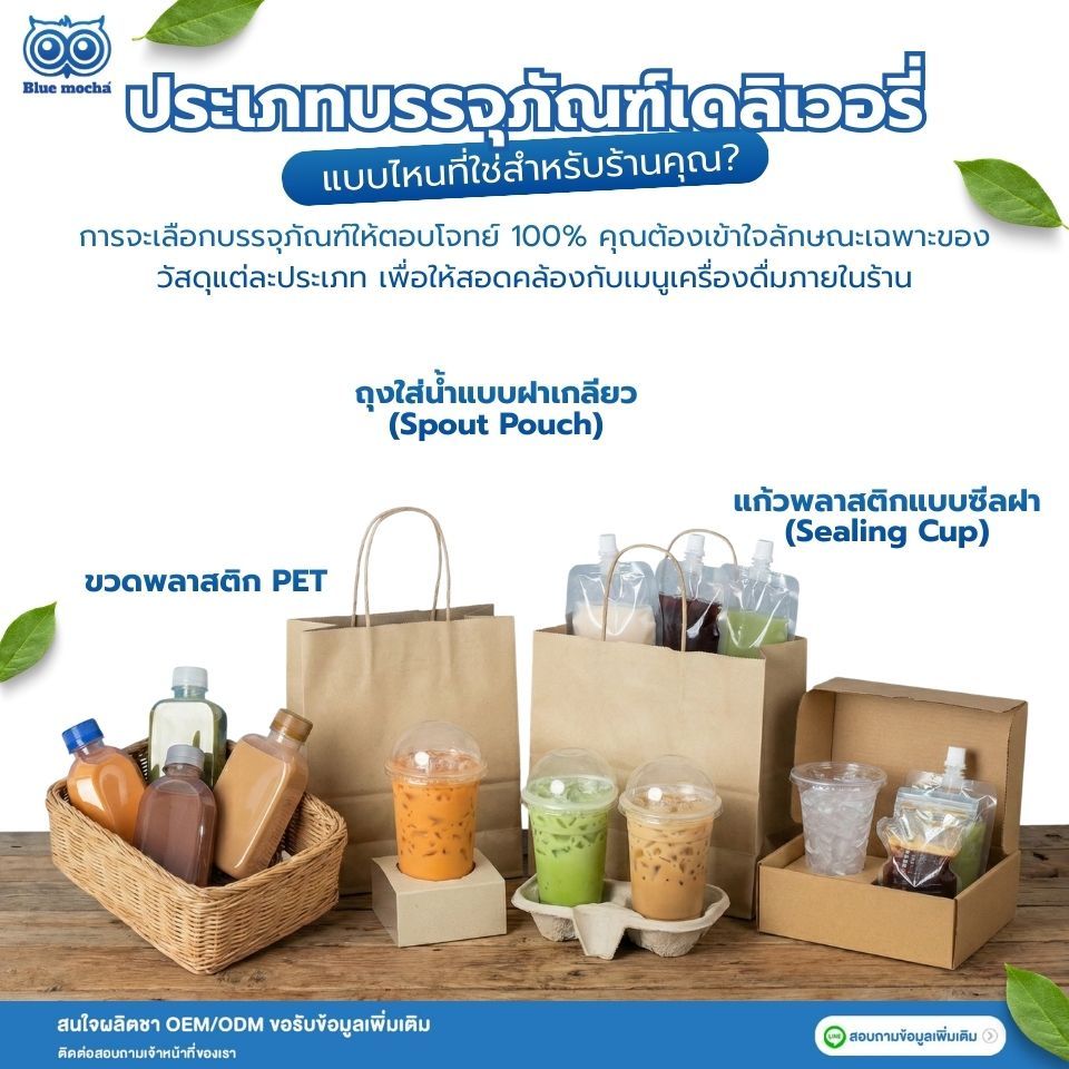 แม้จะเป็นการส่งแบบเดลิเวอรี่ แต่บรรจุภัณฑ์คือ "หน้าตา" ของร้าน การใช้ขวดทรงสวยหรือถุงฝาเกลียวที่ออกแบบมาอย่างดี จะช่วยเพิ่มมูลค่าให้กับเครื่องดื่มธรรมดา ๆ ให้ดูเป็นเมนูพรีเมียมที่ลูกค้าอยากถ่ายรูปแชร์ลงโซเชียลมีเดีย