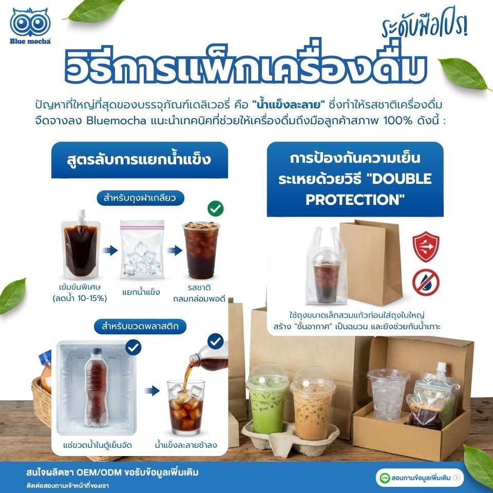 ปัญหาที่ใหญ่ที่สุดของบรรจุภัณฑ์เดลิเวอรี่ คือ "น้ำแข็งละลาย" ซึ่งทำให้รสชาติเครื่องดื่มจืดจางลง ทีมงาน Bluemocha แนะนำเทคนิคที่ช่วยให้เครื่องดื่มถึงมือลูกค้าสภาพ 100% ดังนี้ :