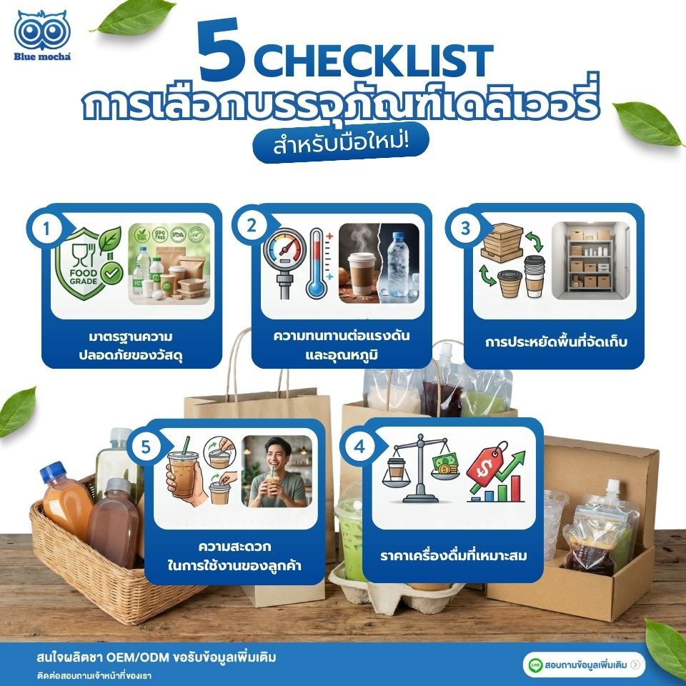 การเลือกบรรจุภัณฑ์เดลิเวอรี่ ไม่ใช่แค่การเดินไปซื้อที่ร้านค้าส่งแล้วจบไป แต่ต้องพิจารณาถึง "Customer Journey" ตั้งแต่เครื่องดื่มออกจากเคาน์เตอร์ไปจนถึงมือลูกค้า นี่คือ 5 เช็คลิสต์ที่คุณต้องพิจารณา :