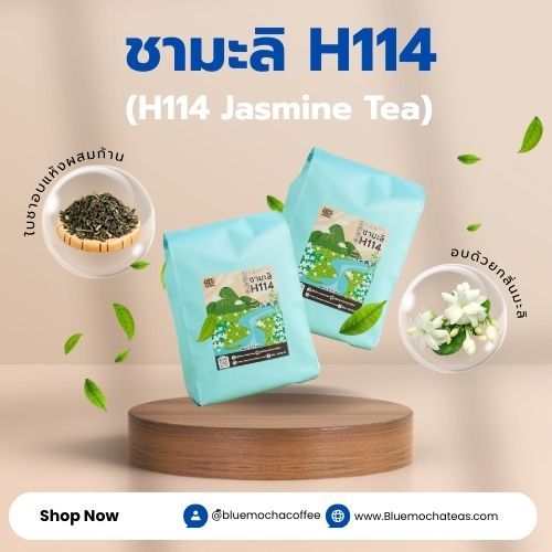 สำหรับผู้ประกอบการที่มองหาชาที่มีกลิ่นและรสชาติเข้มข้นเป็นพิเศษเพื่อสู้กับส่วนผสมอื่น ๆ ในเมนู ชามะลิ H114 คือคำตอบที่ใช่! ชาชนิดนี้ผลิตจากใบชาอู่หลงแท้อบผสมก้าน และอบรวมกับดอกมะลิแห้งตามสูตรลับของโรงงาน Bluemocha โดยใช้เวลาอบที่นานกว่าปกติ เพื่อให้ได้รสชาติที่เข้มข้นขึ้น กลิ่นหอมชัดเจนและทนทานไม่จางหายไปง่าย ๆ สีน้ำตาลเหลืองทอง น้ำชาเข้มข้น มีกลิ่นหอมของดอกมะลิแท้ รสฝาดเล็กน้อยแต่กลมกล่อมลงตัว ใบชาอบผสมก้าน เพิ่มความเข้มข้นของรสชาติ เหมาะสำหรับเมนูชงได้ทั้งแบบร้อนและเย็น ไม่แนะนำให้ใช้ไซรัปที่มีกลิ่นแรง เพราะจะบดบังกลิ่นมะลิแท้